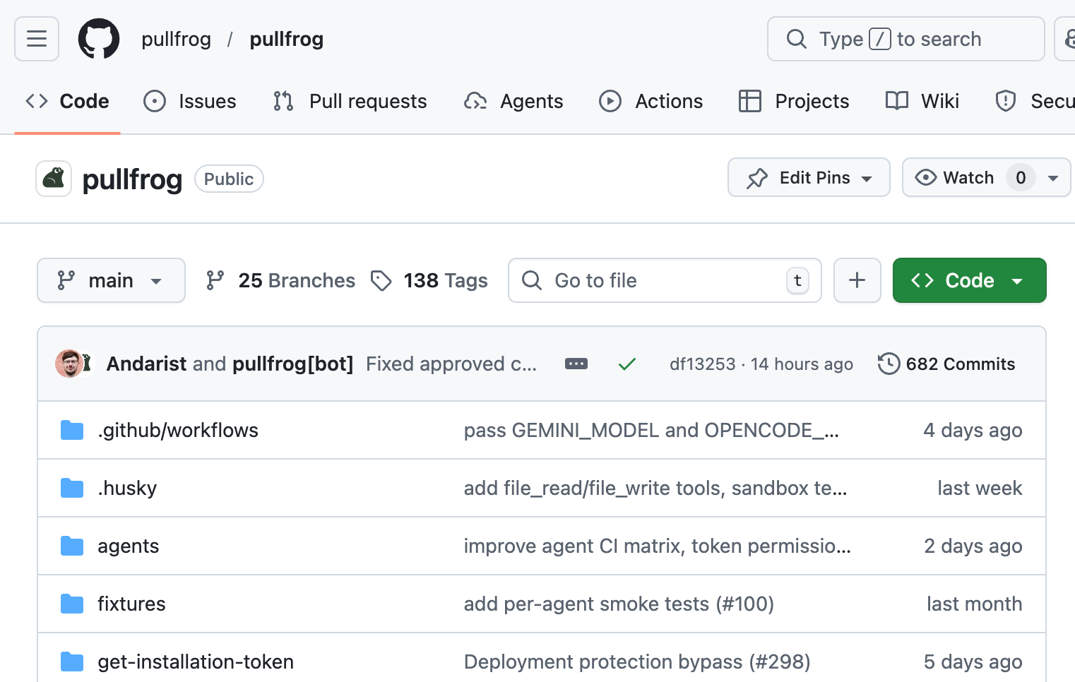 Like a good human colleague, Pullfrog detects CI failures on its own PRs and attempts a fix. It can be configured to attempt CI fixes on human-created PRs too.